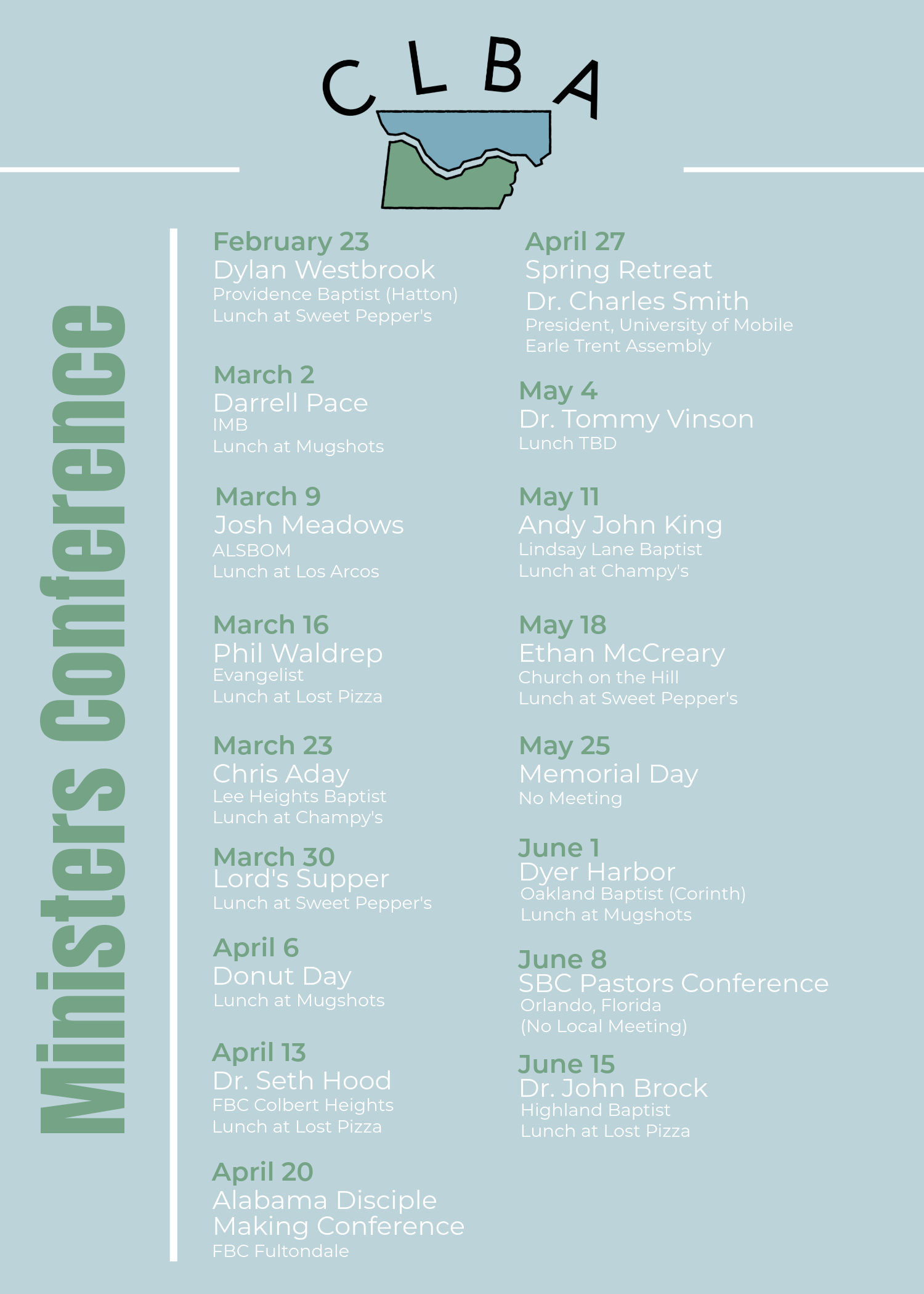 Feb 16 to Jun 15 CLBA Ministers Conference 2026 Mon, Feb 16, 2026 10:30 AM 10:30 Mon, Jun 15, 2026 11:30 PM 23:30 Colbert Lauderdale Baptist Association (map) Google Calendar ICS View Event →